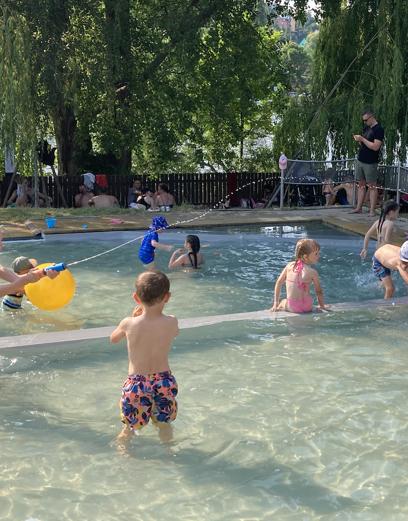 Mais avant de retourner à Vysehrad pour y passer la nuit, c’est au bord de la Vlatva que l’on passe l’après-midi pour se rafraichir. On s’attendait à trouver une plage aménagée pour se baigner dans la rivière, on arrive en fait dans une sorte de piscine parfaite pour les enfants. L’entrée est payante mais très accessible. Apparemment, il y a aussi un endroit juste à côté pour se baigner dans la Vlatva (il fallait prendre à droite en arrivant, nous on a pris à gauche, mais pas de regrets, on est très contents de cette trouvaille). L’endroit est prisé des familles pragoises et on y passe tout l’après-midi, les enfants sont ravis !