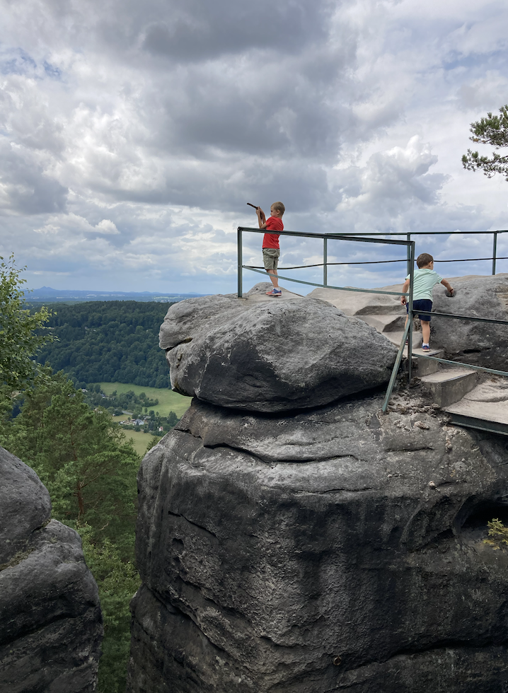 Après le paradis de bohème, direction la Suisse bohémienne, autre parc national dans le nord de la Tchéquie. On est juste à quelques kilomètres de l’Allemagne, de l’autre côté de la frontière c’est la Suisse saxonne. On consacre la matinée à une nouvelle randonnée pour monter à Malá Pravčická brána, en passant par Šaunštejn, un ancien château en ruine. On ne se lasse pas des paysages de pierres et des passages escarpés entre les rochers. Quelques endroits sont un peu aériens mais ça passe très bien même avec des enfants.
