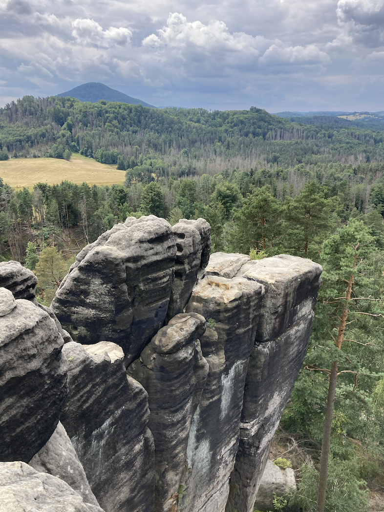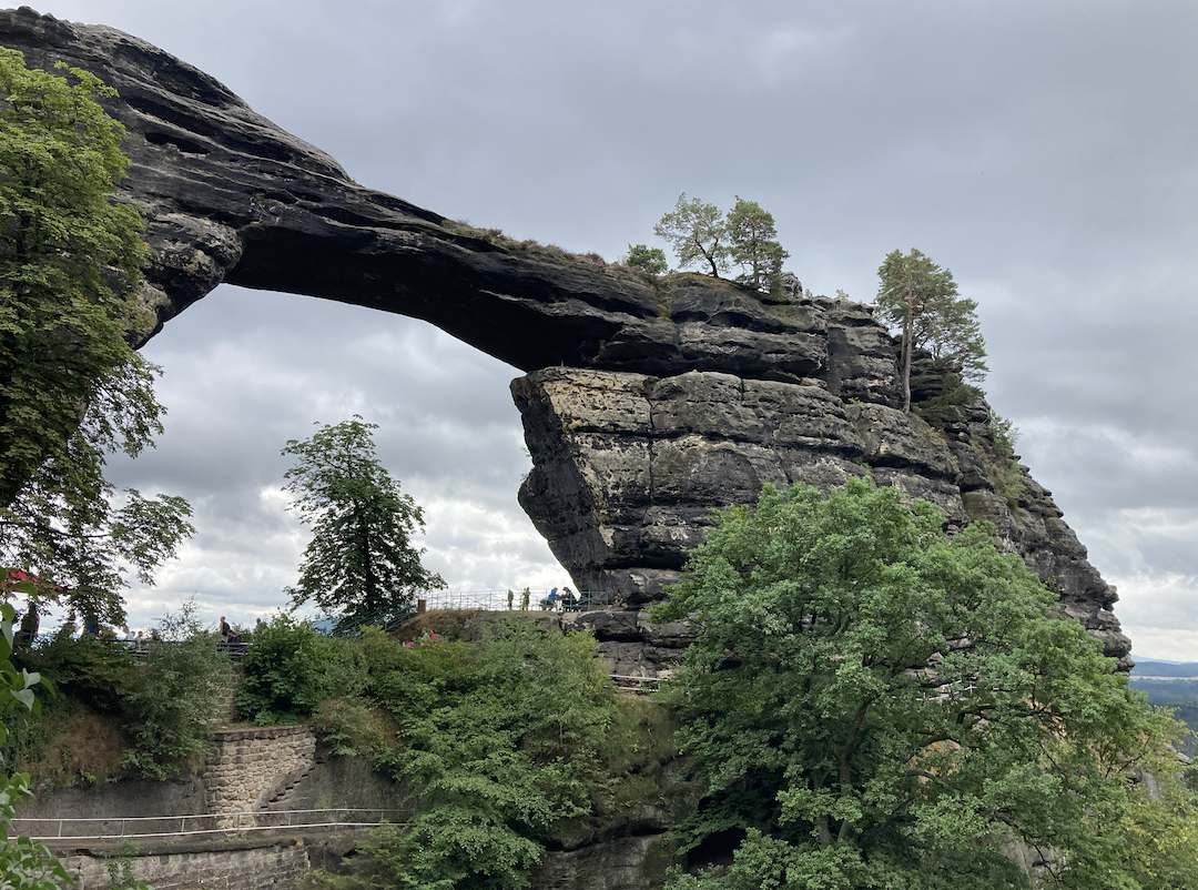 Le lendemain, dernière randonnée du séjour à Pravčická brána, plus grande arche naturelle de la région. Le parking est très réglementé (on a vu des voitures garées hors des zones officielles immobilisées avec des sabots), ça se comprend vu l’énorme incendie qui a ravagé la zone il y a quelques années. Le paysage en est encore bien marqué d’ailleurs.
