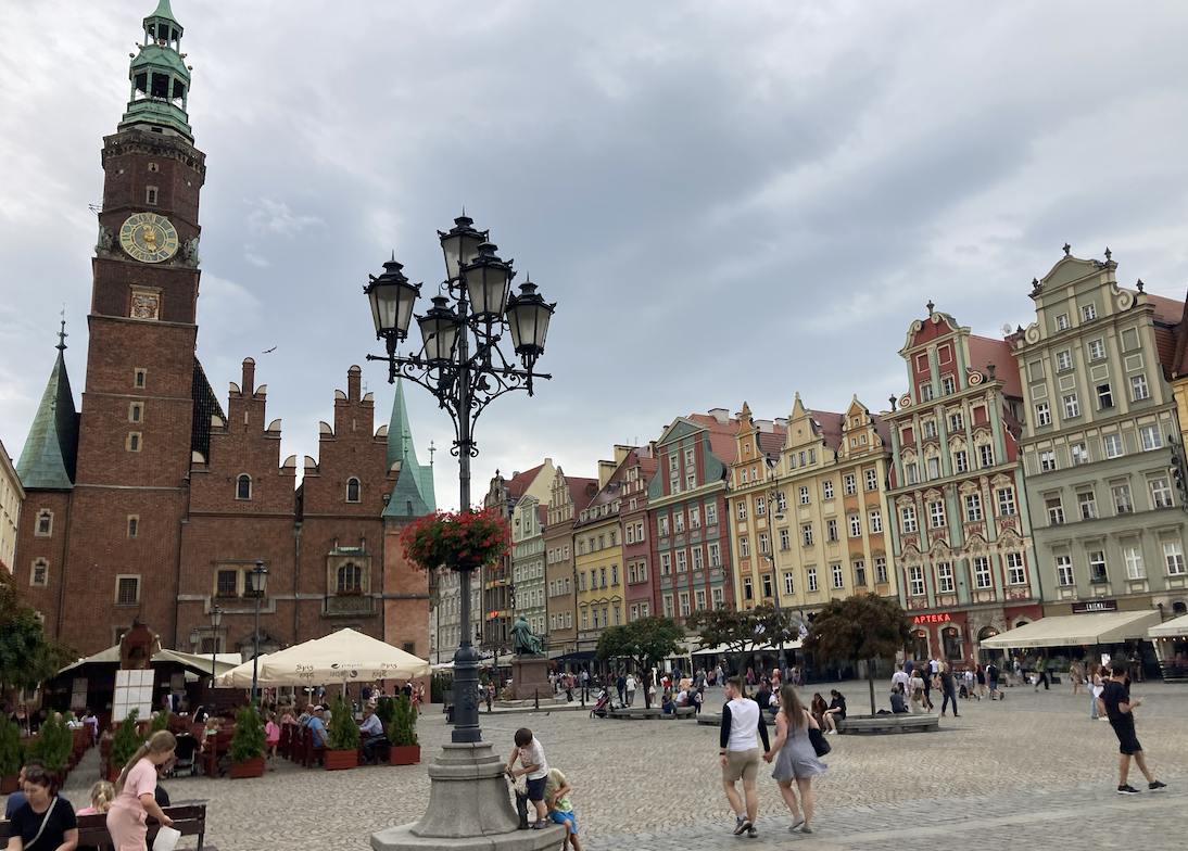 Très belle surprise pour cette étape à Wroclaw (encore une ville au nom imprononçable !). Le centre ville est vraiment charmant. On sent clairement les influences allemandes dans le style architectural et encore plus qu’à Cracovie, on voit la proximité des polonais avec l’Ukraine : il y a des drapeaux ukrainiens partout.