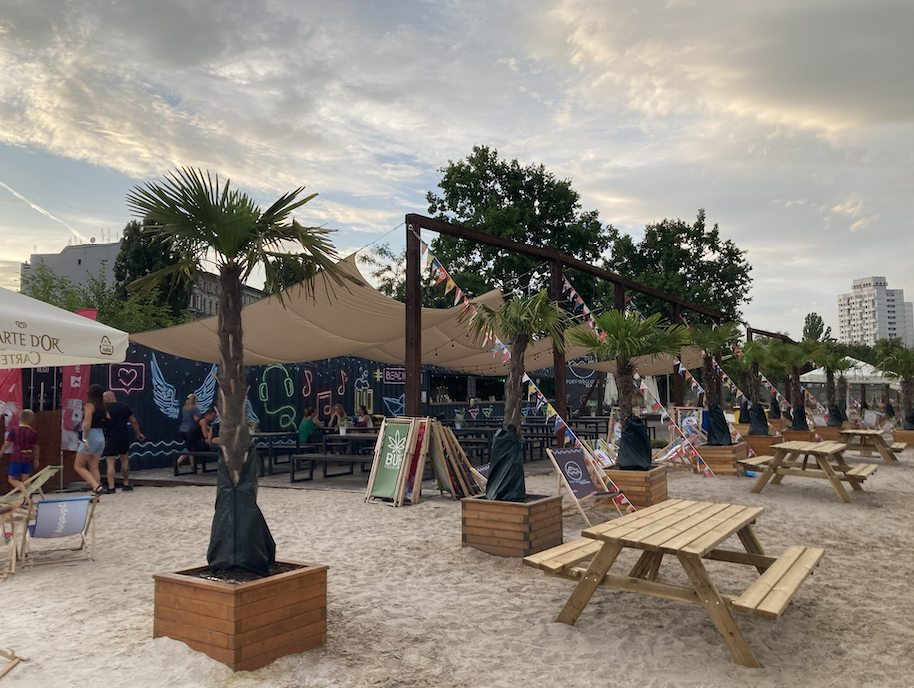 Enfin, on finit la journée au sud-est de la ville, où on trouve une autre aire de jeux très sympa, mais également un beach bar. C’est assez étonnant de trouver ce genre d’établissement car on n’est pas à côté de la mer, mais ça a l’air d’être la spécialité de la ville car il y a pas mal d’adresses similaires. On est lundi soir et la météo n’est pas extra donc il n’y a vraiment pas grand monde, mais ça doit être très animé le week end !