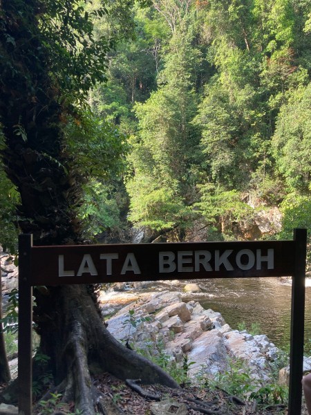 La dernière étape est la plus longue : une petite marche de 15-20 minutes nous amène à Lata Berkoh, une sorte de petit canyon où on peut se baigner. C’est très joli, la rivière est très rafraîchissante, mais il y a une énorme quantité d’insectes qui ressemblent à des guêpes et qui tourbillonnent autour de tous les touristes (notre guide du soir nous a indiqué qu’elles sont attirées par la transpiration, mais aussi par le répulsif moustique à la citronnelle). Bref, le déshabillage / rhabillage est un peu un challenge et on ne s’attarde pas sur place !