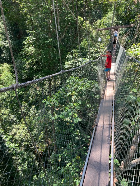 Le Taman Negara fait partie des incontournables de la Malaisie, et offre un peu d’aventure et de contact avec le monde sauvage. Avec de jeunes enfants, difficile de s’éterniser et d’aller au delà des activités très touristiques qui permettent juste d’avoir une vision superficielle de la forêt. Même si nos enfants sont de bons marcheurs, ici il fait vraiment chaud et ils fatiguent vite. En tout cas, ça leur illustre concrètement ce qu’est une forêt primaire (on avait justement lu un livre avant de partir sur les forêts et l’importance de la biodiversité). Bref, pas l’étape la plus facile du voyage, mais à faire !